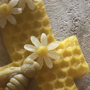 Vela artesanal de cera de abeja decorada con detalles de cera hechos a mano. Cada vela lleva diminutas rosas modeladas y una abejita.