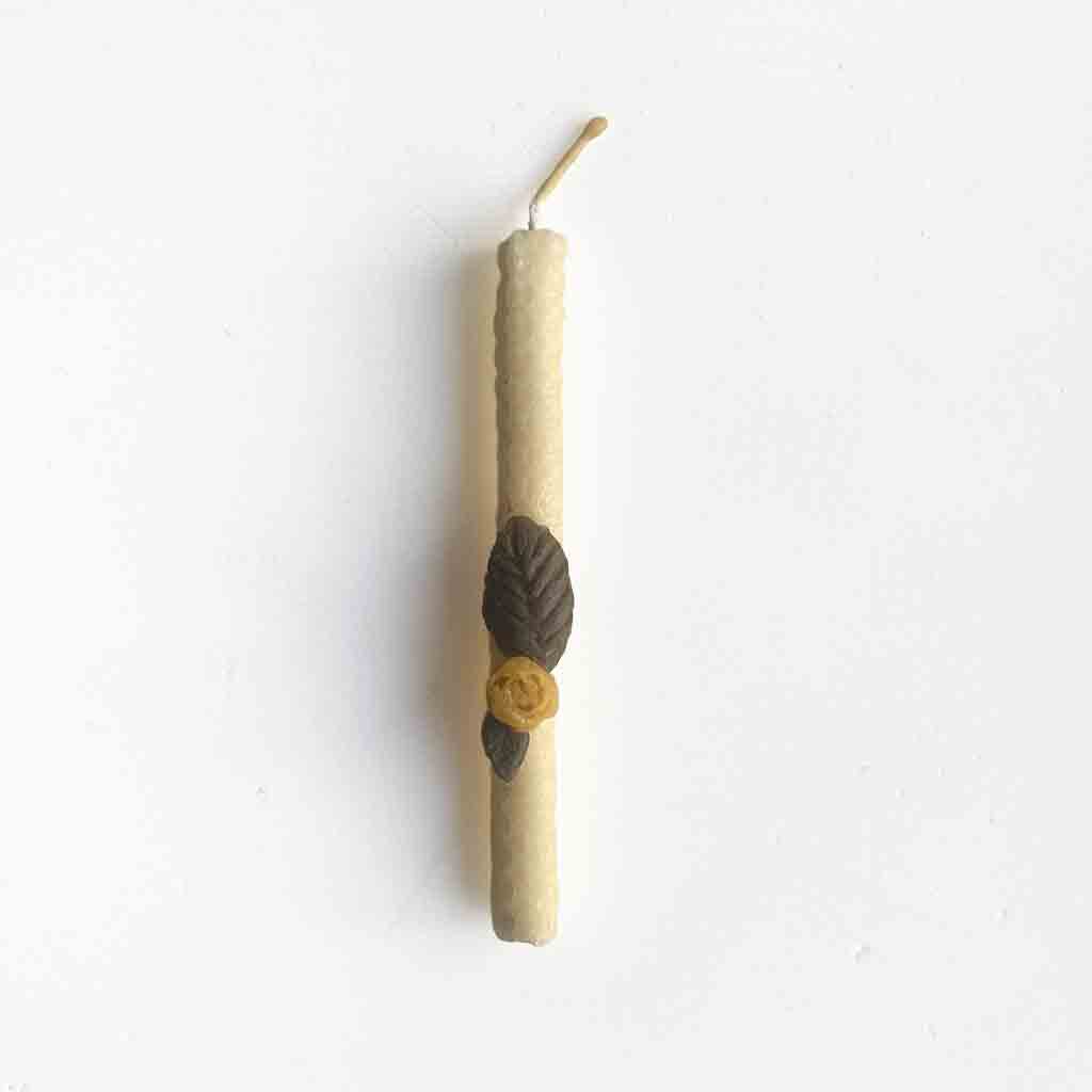 Cada vela está elaborada de forma tradicional, enrollada a mano con cera de abeja blanca marfil. La decoración floral se crea pétalo a pétalo con cera de abeja amarilla y un pigmento orgánico matcha para dar color natural a las hojas.